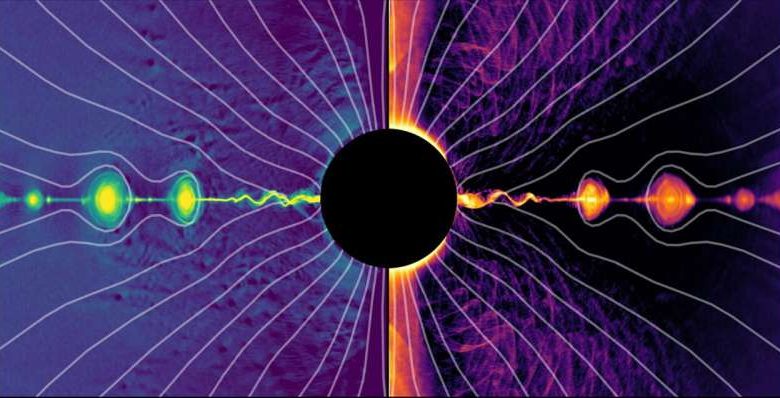 In the equatorial plane of the black hole, the researchers’ calculations revealed intense reconnection activity, leading to the formation of a chain of plasmoids—a condensation of plasma in energetic “bubbles”—moving at nearly the speed of light. According to the scientists, this process is accompanied by the generation of particles with negative energy that is used to power extreme astrophysical phenomena like jets and plasma eruptions.