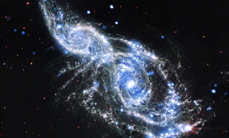 Mid-infrared observations from NASA’s James Webb Space Telescope, shown in white, gray, and red, are combined here with X-ray data from NASA’s Chandra X-ray Observatory, highlighted in blue. Together, these different wavelengths reveal a detailed and layered view of a pair of colliding spiral galaxies, captured in an image released on Dec. 1, 2025.